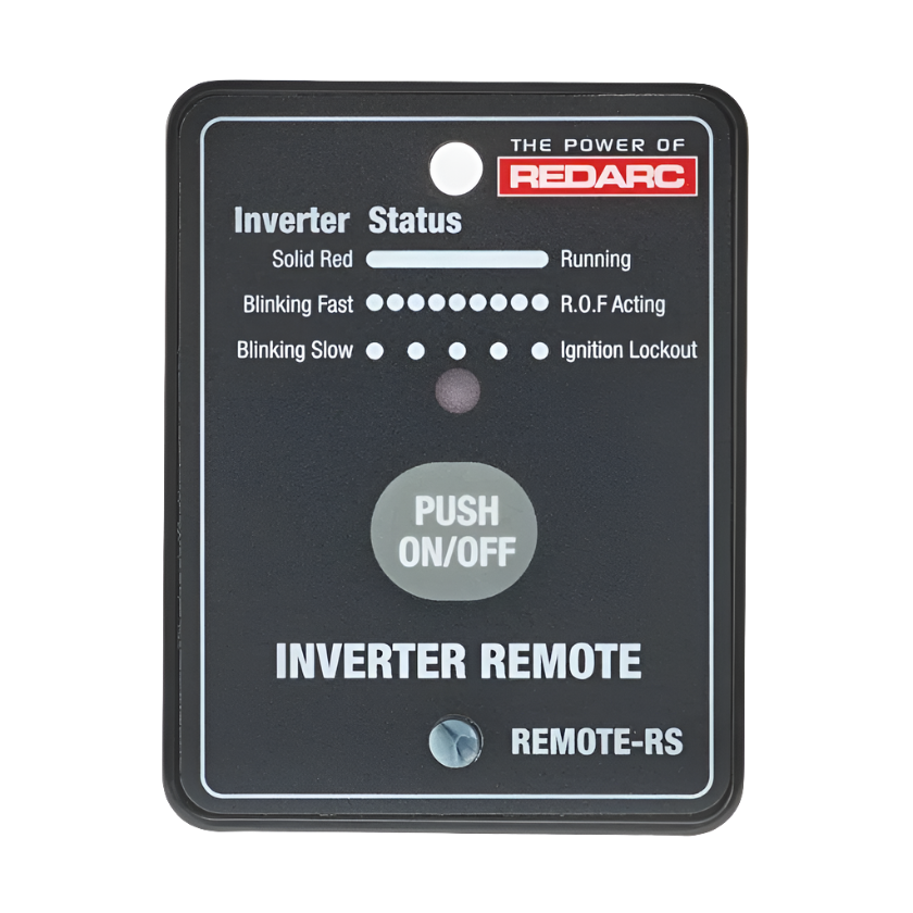 The REMOTE-RS has been designed to work with REDARC RS Series Inverters. It allows remote ON/OFF Switching of the inverter and provides a visual indication of the Ignition Lockout and Return Override Functions.