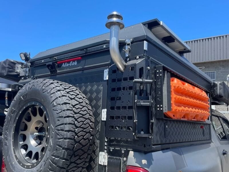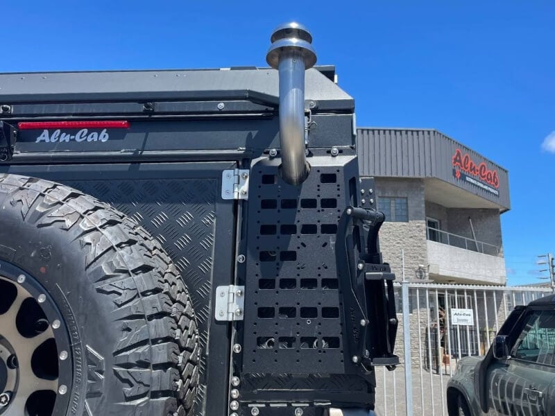 The plate has been modified from our standard Canopy Camper molle plates to allow space for the dickinson chimney. A molle plate is a great place for your equipment and gear to be mounted to the rear of the camper without drilling into the camper itself.