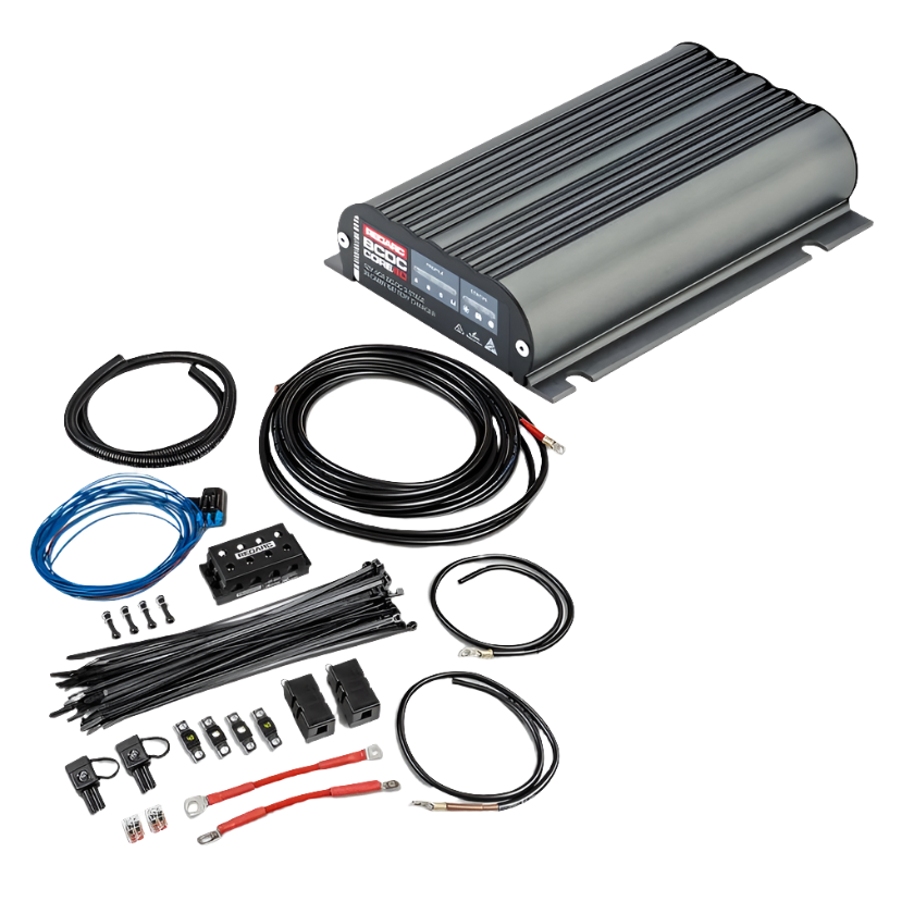 This kit contains all the cables, fuses, fuse holders and connectors required to install the BCDC between the batteries. The cables are even pre-crimped on one end, and through use of the supplied terminal block, the other end of the cables can be trimmed to length to suit the specific installation. The Auxiliary Battery ground cable and solar to Anderson cable are sold separately.
